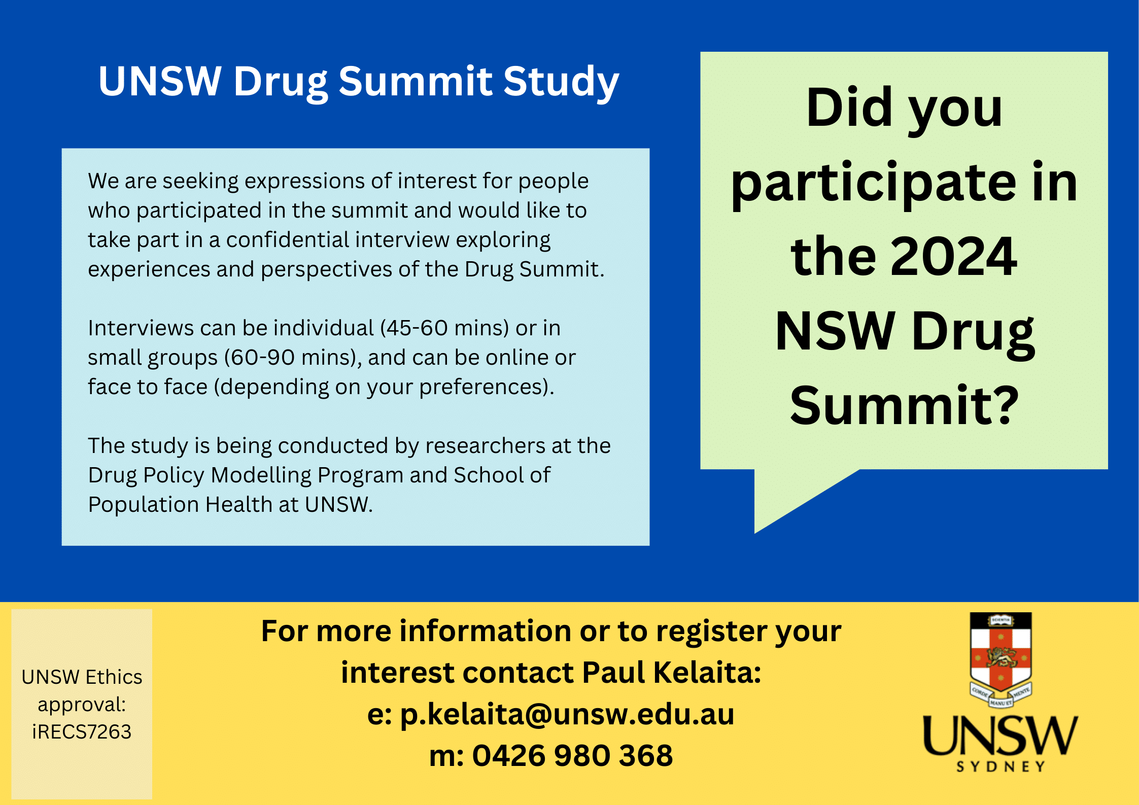 The Drug Policy Modelling Program and School of Population Health at UNSW are seeking expressions of interest for people who would like to take part in a study of the 2024 NSW Drug Summit. We are seeking to evaluate the processes, outputs, and outcomes of the summit. This study has been approved by the UNSW Ethics Committee (iRECS7263). The Chief Investigator of this study is Professor Alison Ritter AO.
